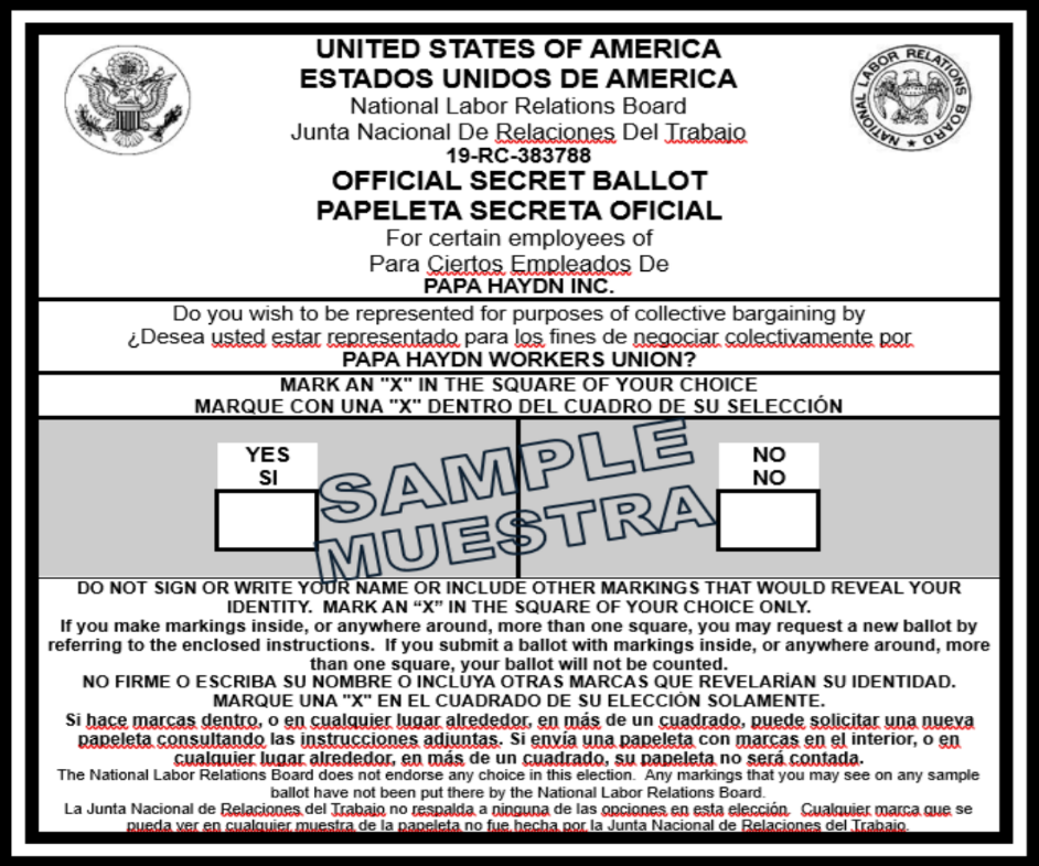 The National Labor Relations Board (“NLRB”) will conduct the vote here at Papa Haydn by United States Mail. Remember the vote is by secret ballot. Below are the details of the election: