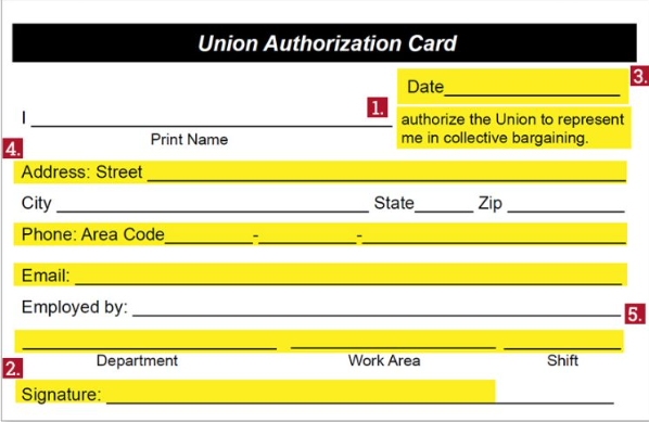 Collecting signatures on union authorization cards is the first step a union must take to organize a group of employees. The Union needs these cards signed – because, by getting signed cards from at least 30 percent of employees in the bargaining unit they seek, the union can file a petition with the NLRB for a union representation election.